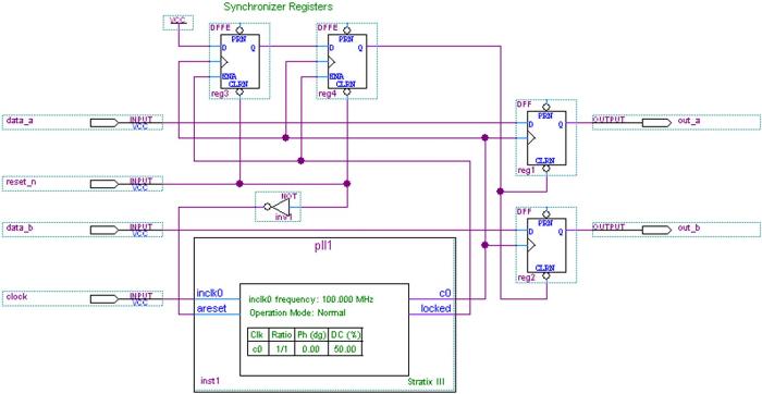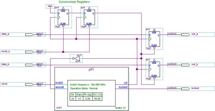 注意到上述代码中同步器的进程模块中多一个条件,即PLL的Locked信号,它作为同步器中的寄存器的同步时钟使能信号。同时注意下面例化的PLL以及两个个进程模块的时钟,这些都是当加入PLL时仅有的变化。