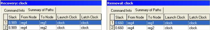 上述分析结果表明,两条路径(reg4到reg1和reg4到reg2)都进行了Recovery和Removal检查。这个电路的Recovery时间检查(就象建立时间检测一样)差不多有9ns的slack,而Removal(就象保持时间检查一样)也有660ps的slack。两个检查都得到通过,意味着这个电路没有时序错误路径。