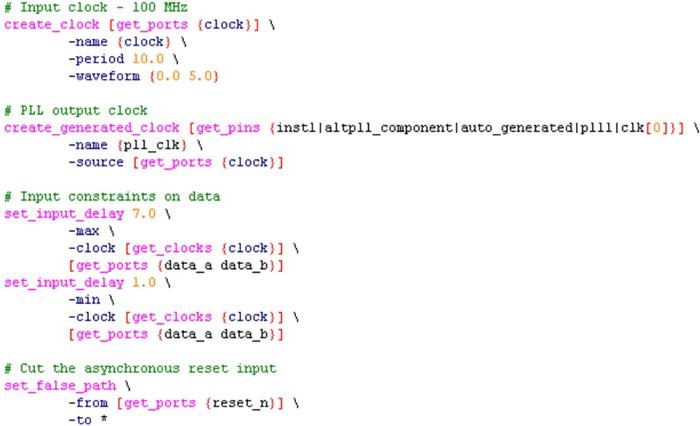 图22是需要给这个电路加入的SDC时序约束,基本和没有使用PLL相同,唯一的区别是需要使用create_generated_clock语句为PLL的输出时钟加约束(注意其实使用PLL后,可以直接使用语句derive_pll_clocks来简单地进行约束)。