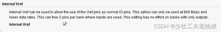 FPGA硬件原理图上, 连接DDR3数据信号的 BANK,若其VREF(比如引脚IO_L6N_T0_VREF_34_R6.......)信号未连接参考电压,FPGA应该使用internal Vref。在我们的设计中,硬件上VREF引脚悬空 ,因此在vivado上,应该勾选internal Vref。如下图:
