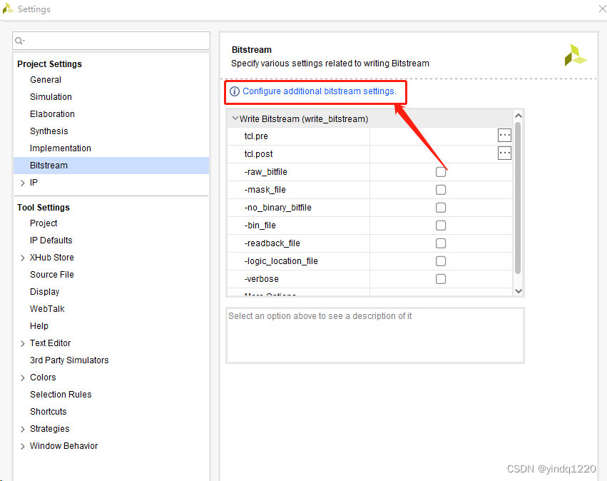 vivado软件工具中,也可以先 Open implemented Design,打开之后,在Tool-setting路径下,点击Configure additional bitstream settings.