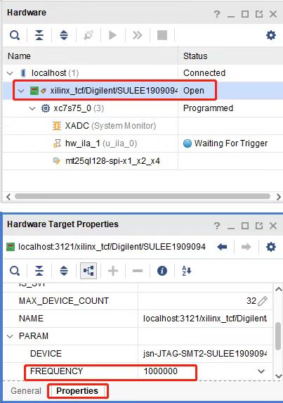 1、烧写器的JTAG时钟必须小于ILA输入时钟的2.5倍。可以根据实际工程情况,设置烧写器的JTAG时钟大小,位置如下图。
