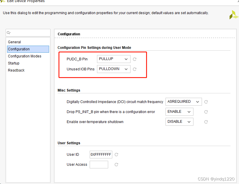 在下图中,选择PUDC_B的上拉与否,以及未使用IO的默认电平。