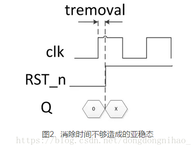 2.时钟有效沿与紧跟其后的异步复位信号释放之间所必须的最小时间称为tremoval(removal time消除时间)。小于这个时间,则触发器的输出端的值将是不确定的,可能是高电平,可能是低电平,可能处于高低电平之间,也可能处于震荡状态,并且在未知的时刻会固定到高电平或低电平。这种状态就称为亚稳态。