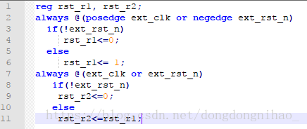 综上所述,为了避免一般的复位信号(直接接在寄存器的clr端口),复位信号和FPGA内部寄存器之间的“异步”性,导致亚稳态极容易出现。