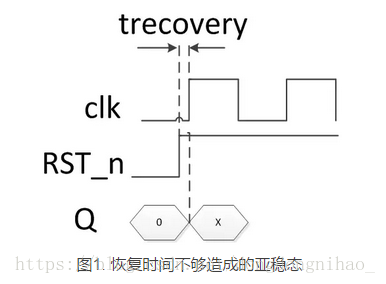 1.异步复位信号释放(对低电平有效的复位来说就是上跳沿)与紧跟其后的第一个时钟有效沿之间,有一个必须间隔的最小时间称为Trecovery(recovery time,恢复时间)。