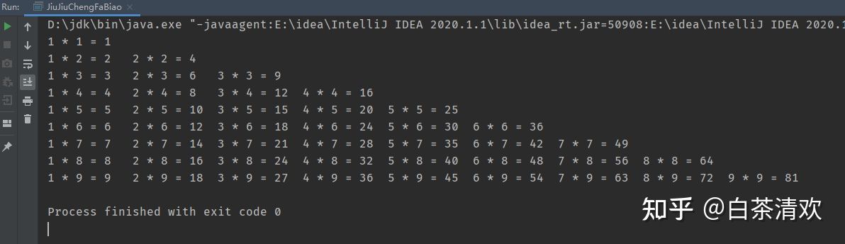 System.out.print(j + " * " + i + " = " + (i*j) +"t");