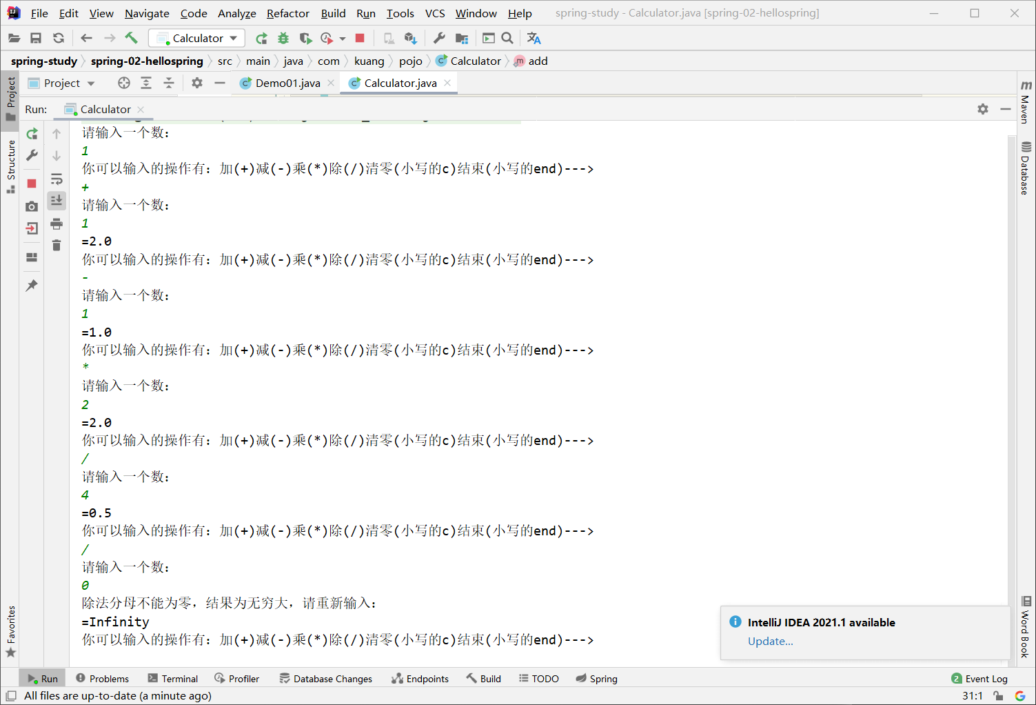 System.out.println("除法分母不能为零,结果为无穷大,请重新输入:");