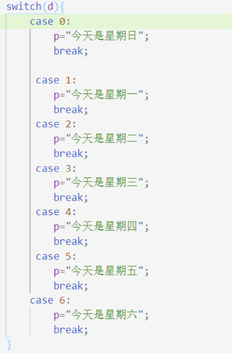6、设置switch循坏,按照声明的变量d判断今天星期几,如果今天是星期天那么就执行0,break立刻跳出循环(跳到大括号)执行下一行代码。