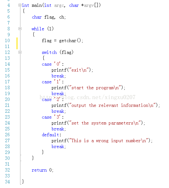 可以将flag 定义成 int型, 然后输入 scanf("%d", &flag), 然后case中的选项也要相应变换,如 case ‘0’ --> case 0