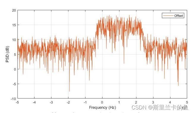 第一个式子是在说我们要做我们收到的信号并把它平方倍,然后再做DTFT(discrete time Fourier transform)。第二个式子是在说我们要找到它在PSD中最高的那个y值所读应的x值,也就是我们的frequency offset。直接看matlab代码实现: