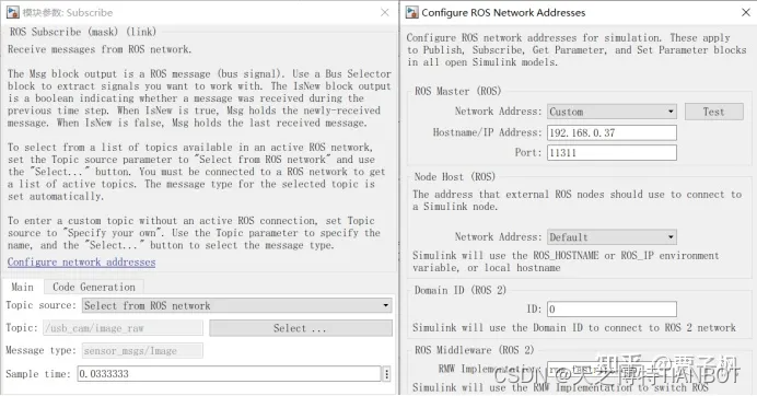 后面建模使用消息接收模块的时候也需要配置ROS的网络。同时要根据消息发布频率设置Sample Time,仿真时间才能和实际时间符合。