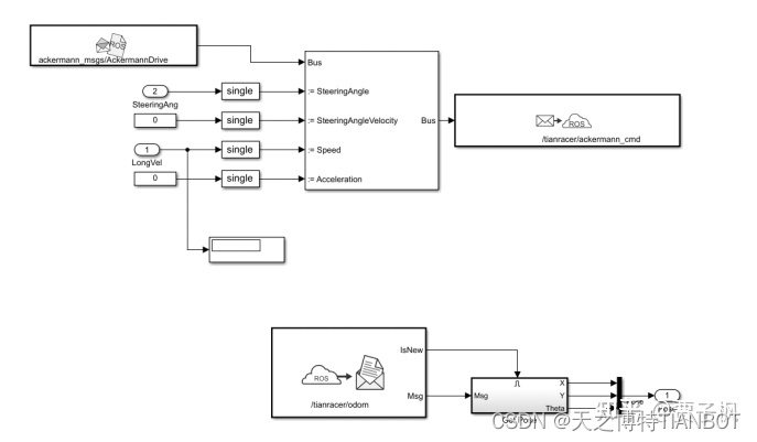 打开Robot Model的子模块,这里要根据无人车的话题名称修改输入输出。对于Tianracer无人车,就是需要下发控制指令(/tianracer/ackermann_cmd),接收里程计信息(/tianracer/odom)。大家如果自己有ROS无人车,可以根据自己的小车话题进行修改。当然Gazebo仿真中的ROS无人车也是可以的。