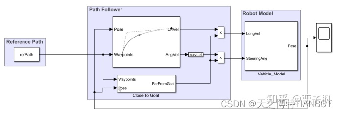 输入参考路径,然后利用Pure Pursuit模块进行跟踪,将执行信号传送给Robot Model。