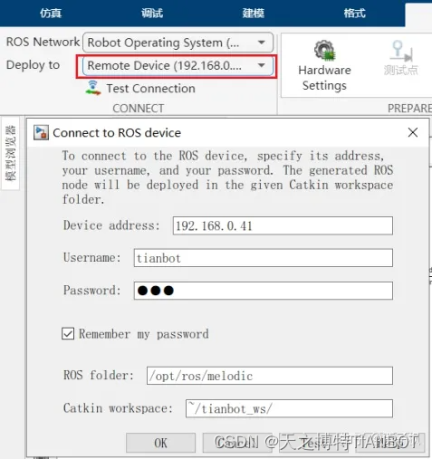 控制背景的研究者都比较熟悉Simulink。通过Simulink连接ROS,大多数操作都可以通过图形化界面实现,低代码的方式也比较适合入门学习者。要和ROS通信并使用完整功能,需要在Simulink APP中打开ROS后设置网络,并且在订阅消息模块中设置ROS网络。注意要设置好ROS的安装目录以及工作空间以便后面Coder部署的时候使用。