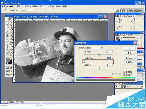 5、将饱和度调至最左边,图像变为黑白。点击OK.