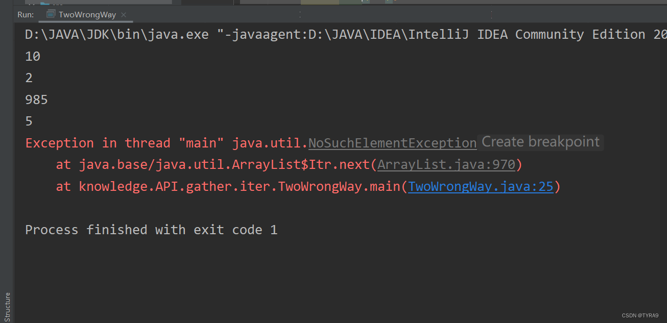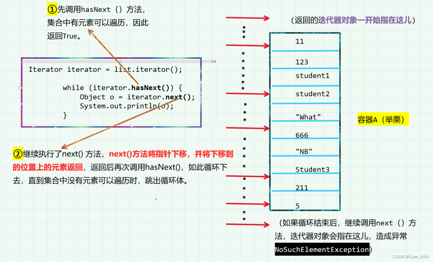 而最后为什么会报出NoSuchElementException(没有该元素异常),原因:两个next()方法中终究会有一个next方法使得引用的指向指在最后一个元素的下面,从而造成异常。 PS:当集合中一共存在奇数个可遍历元素时,是输出语句中的next()方法造成的异常,当集合中一共存在偶数个可遍历元素时,是判断语句中的next()方法造成的异常。