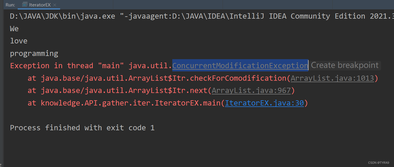 在迭代器常用方法的代码演示中,我们成功利用迭代器遍历出了"We love programming " ,但现在up想整点儿不一样的,比如,在迭代器遍历中加入一个判断条件,如果集合中存在"programming "元素,我们就在它的后面添加一个"forever!"字符串的元素。up以IteratorEX类作为演示类,IteratorEX类代码如下: