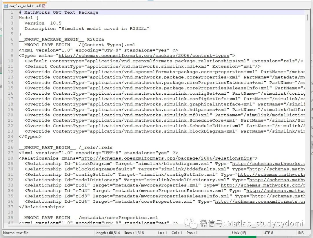 相同的模型分别存成complex_model1.slx格式和complex_model1.mdl文件,然后分别用记事本打开,可以看出slx文件打开后为乱码,mdl文件打开后为文本,这些文本描述了模型的特性。