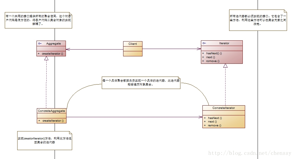 (2)每一个聚集对象都可以有一个或多个迭代子对象,每一个迭代子的迭代状态可以是彼此独立的。因此,一个聚集对象可以同时有几个迭代在进行之中。