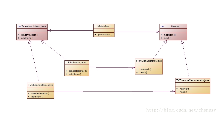 然后是菜单接口,该接口提供返回具体迭代器的方法:createIterator()。