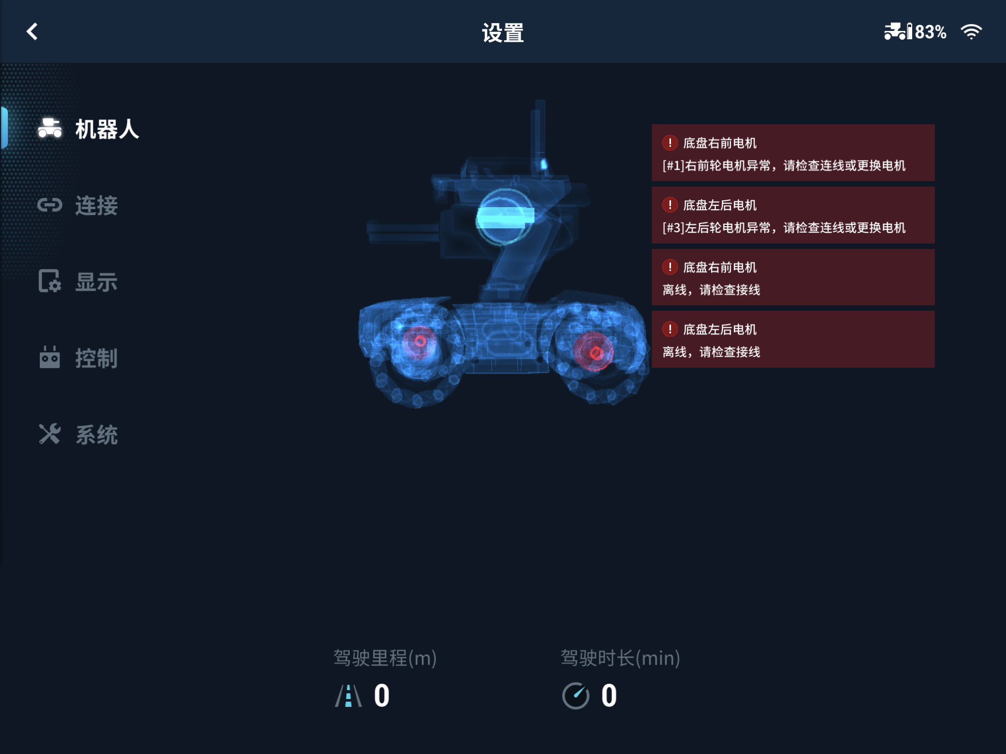 2. 已查明出现图中问题的原因是没有进行电机校准(在“系统”选项卡中),首先进入电机校准,按照提示使用轮胎模具抬起小坦克的身体,并按照给定顺序转动4个轮子,验证完毕即可。