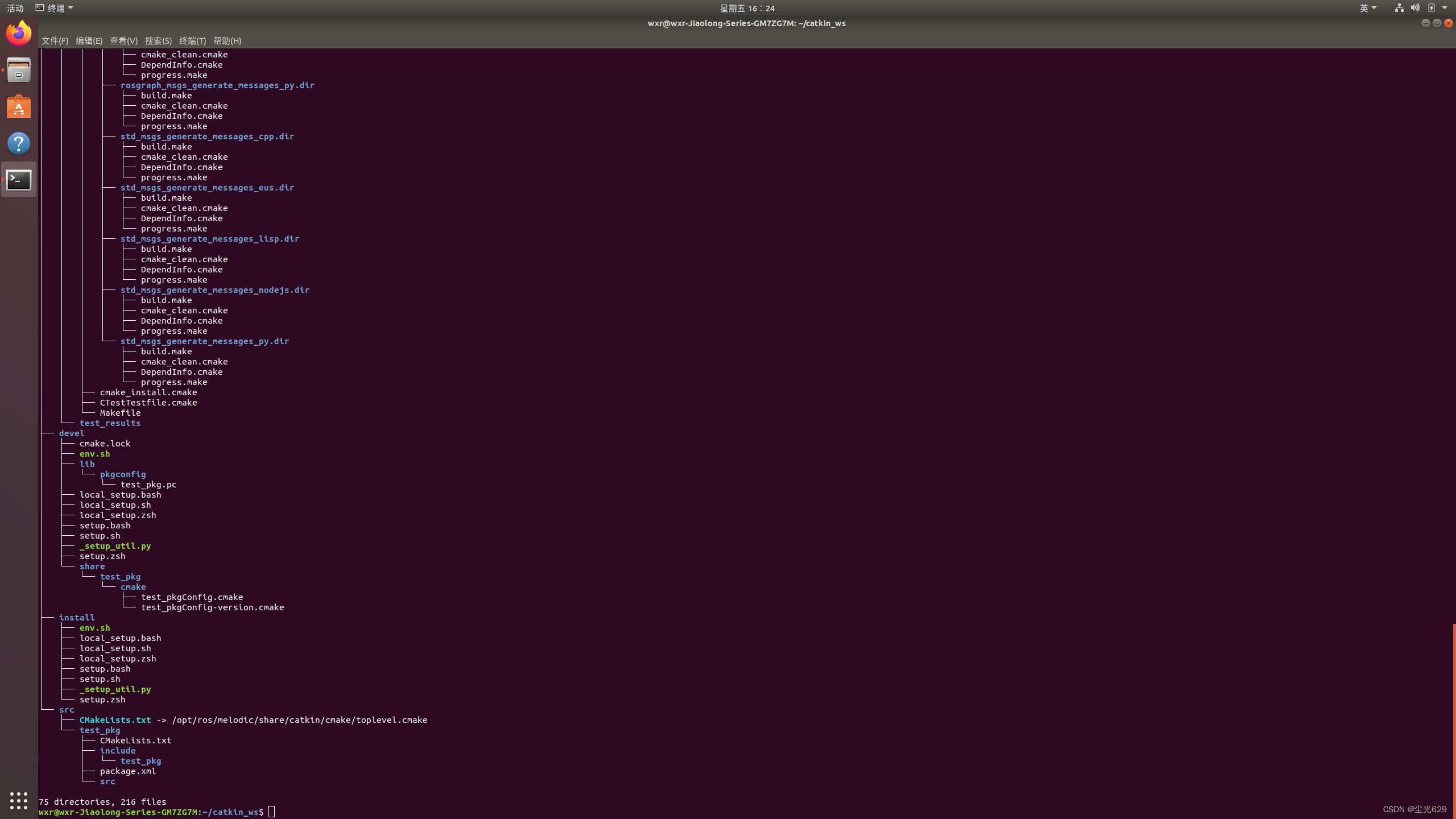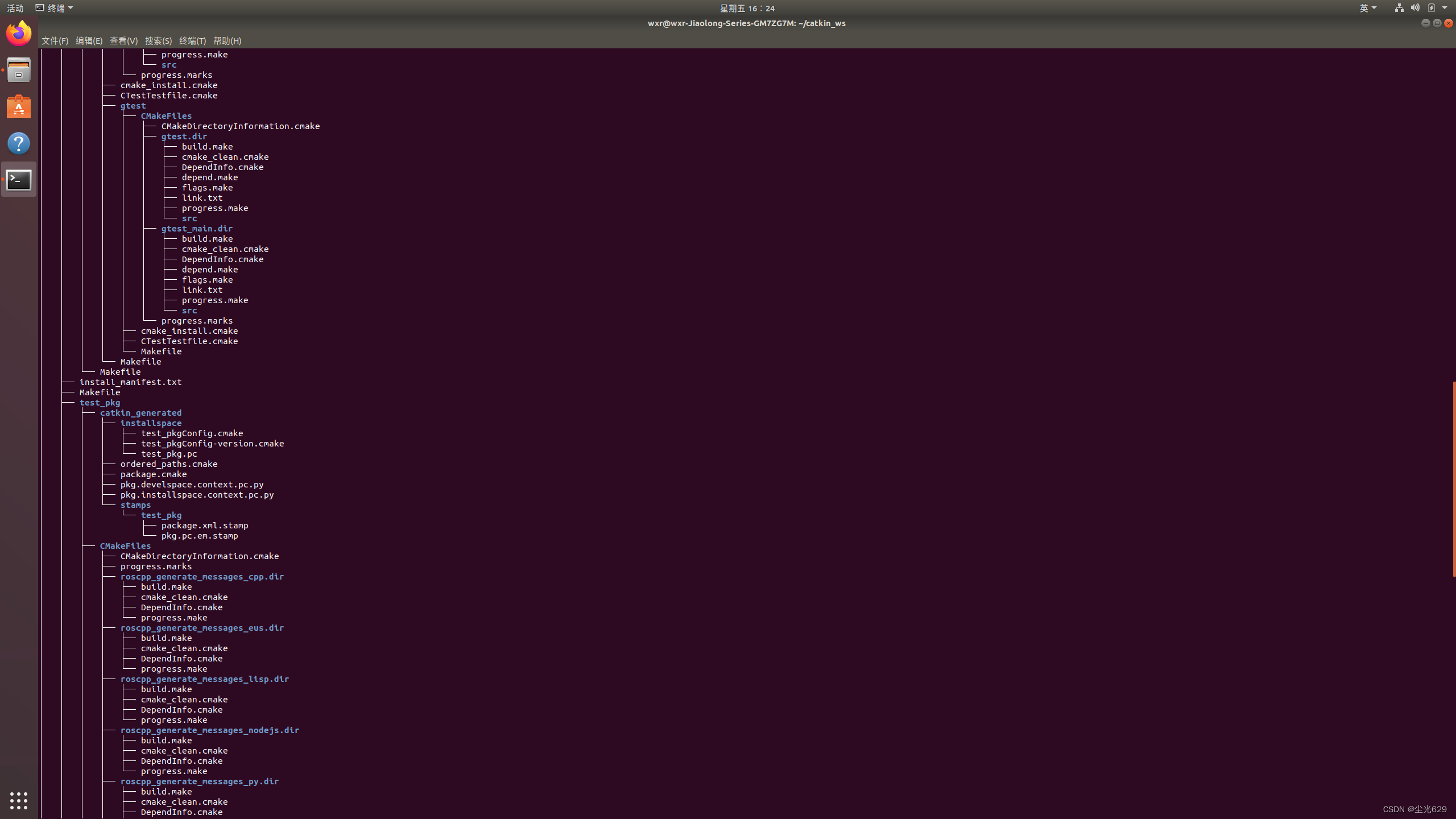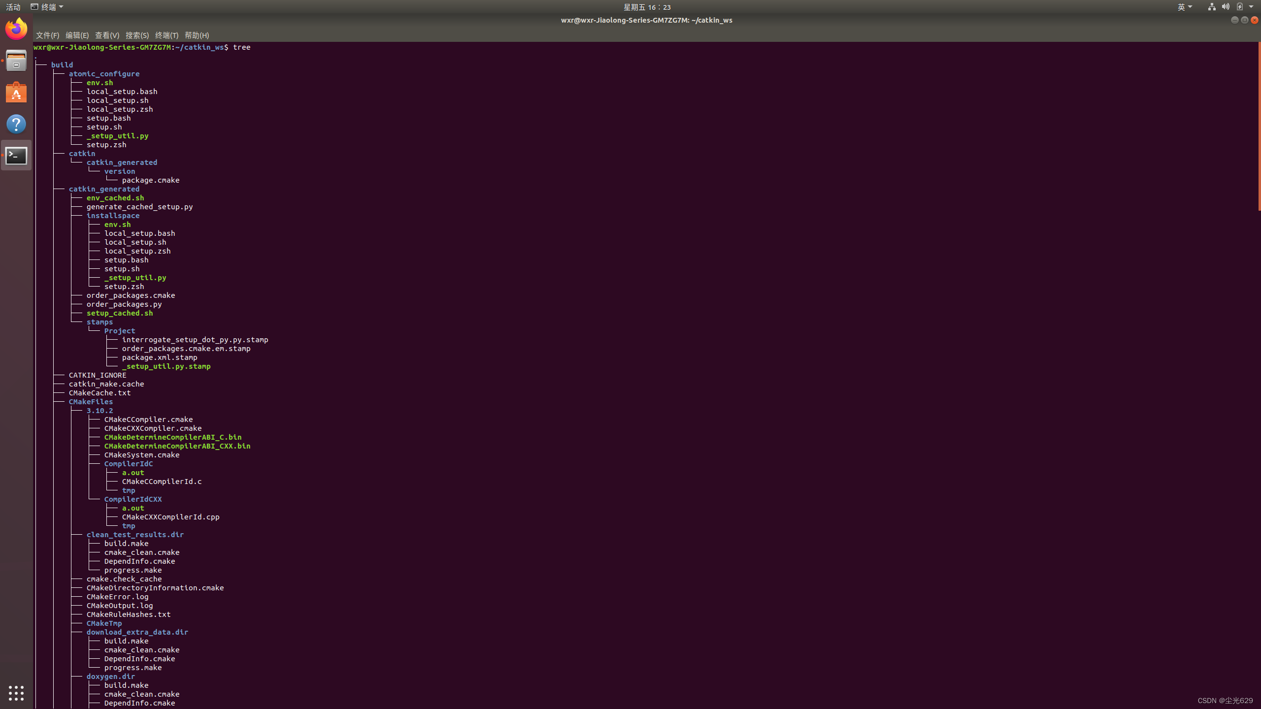 在终端中使用 list 或 tree 命令即可查看当前目录下的文件和文件夹,如下图所示,这是我刚创建好的一个工作空间(下文会详细阐明),是由Packages、Manifests、Repositories、Messages和Services几部分组成。各部分又是以.cmake .make .py .cpp等格式的文件而构成的。