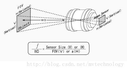 如图所示,在已知相机CCD尺寸、工作距离(WD)、视野(FOV)的情况下,可以计算出所需镜头的焦距(f)。