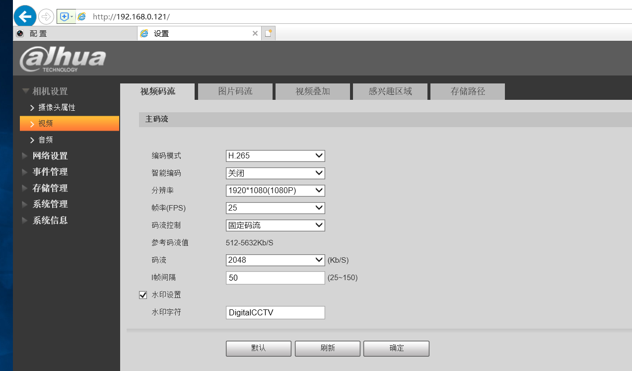 主码流:rtsp://admin:admin123456@192.168.0.121:554/cam/realmonitor?channel=1&subtype=0