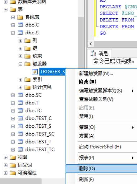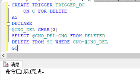 创建触发器,并且设定触发器条件为DELETE,接下来设置具体触发条件,目标为从C表的改变到SC表中课程的删除。