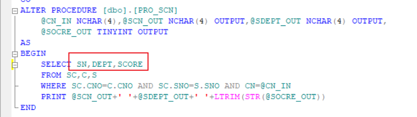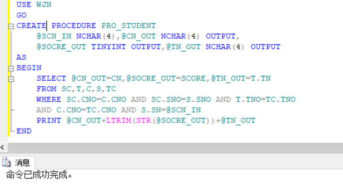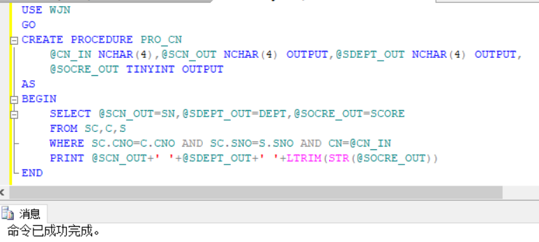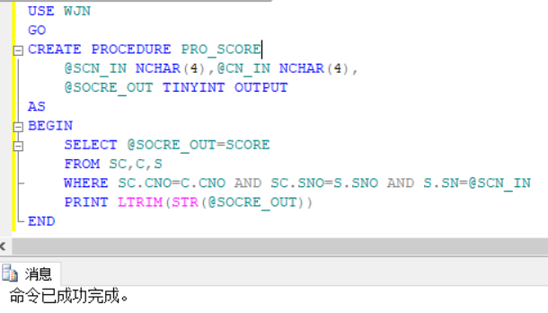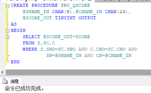 新建查询,创建存储过程,首先声明变量,并且声明变量的类型,采用表的连接方式,并且执行条件语句WHERE选中该学生与该课程,在SELECT中即可完成参数的传出。