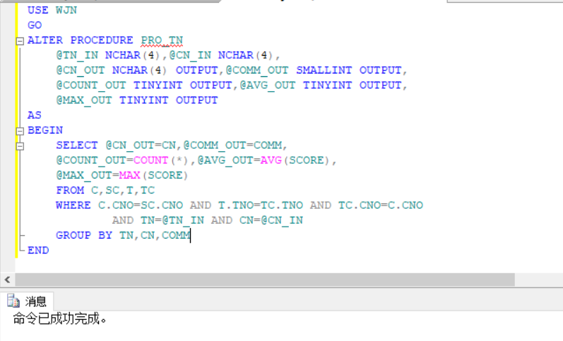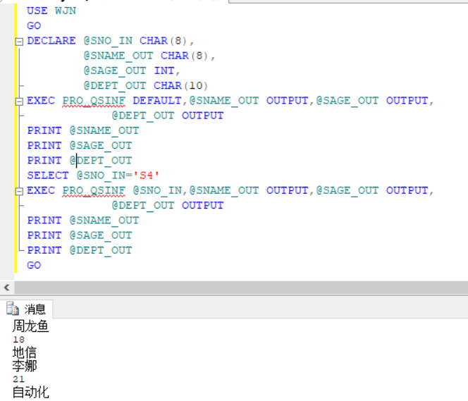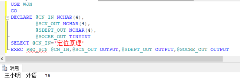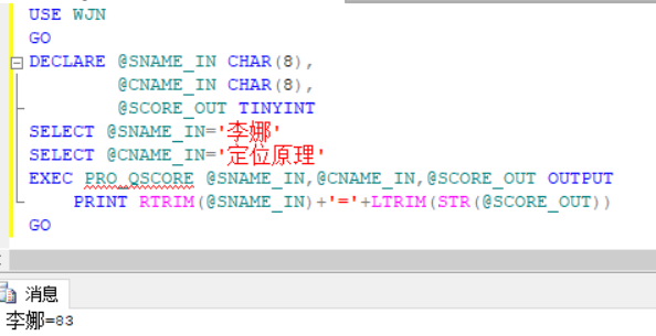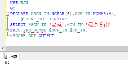 执行T-SQL语句,同样先声明变量与存储类型,再采用SELECT进行赋值操作,也可以采用SET对学生名与课程名进行赋值,最后再调用存储过程,将参数输入,最终在调用存储过程后将学生姓名与选课成绩打印出来。