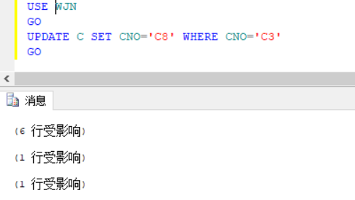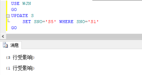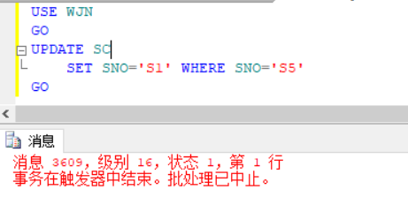 对SC表更新学号,观察S表中学号变化情况,可以看出触发器可以正常运转,并且将批处理中止。