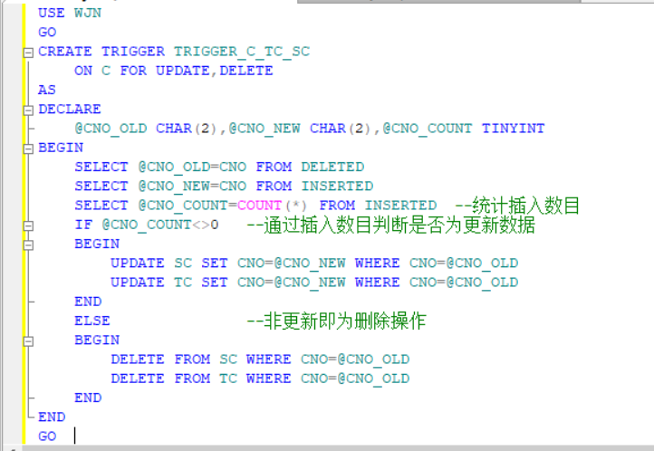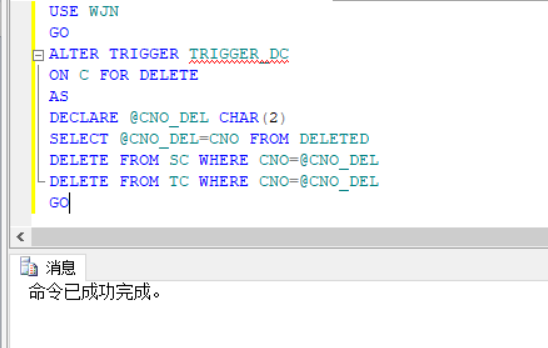 主要过程实现为对C表创建触发器,触发器实现条件为C表的更新与删除,并且是对于SC与TC表相对于课程发生变化,触发器创建如下:
