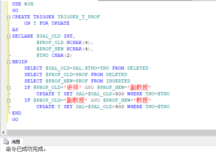 创建存储过程,该过程是单表内部的级联更新,先在初始表中保存工资值,再删除表中保存删除的职称,在插入表中保存插入的职称,接下来对职称进行判断,满足“讲师”到“副教授”,则设置其工资在原始工资上增加500元,若满足“副教授”到“教授”,再初始工资上增加900元。代码如下: