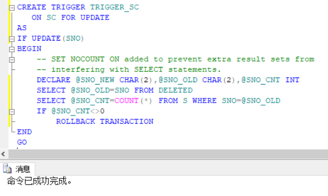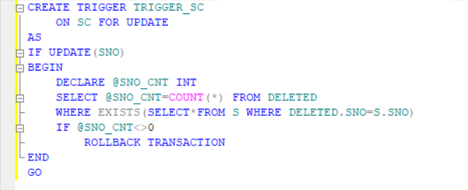 对SC表创建触发器,由于更新过程涉及到表DELETED,因此将删除的SNO保存为SNO_OLD,并对S表中的SNO与更新SC表前的SNO进行对比,若存在1或多条数据,由COUNT函数记录,并且当COUNT函数结果不等于0时,触发器停止运行,过程终止(ROLLBACK TRANSACTION)。