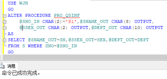执行方法是采用Alter语句,将存储过程整体结构重新编写修改,修改查询结果为查询姓名、性别与系名,并且将学号的默认值修改S1