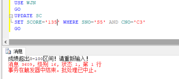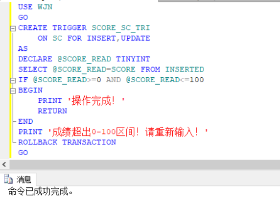 采用判断语句,对插入或更新表中成绩数据时,进行判断成绩的范围,满足时打印插入或修改成功,不满足时触发器自动中止该过程。