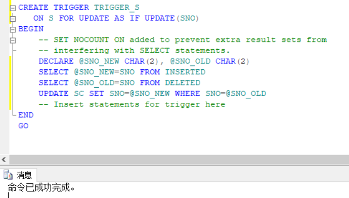 该触发器作用:修改表S中学号时,SC表中该学生选课记录的学号相应发生变化,与外键相似的效果。