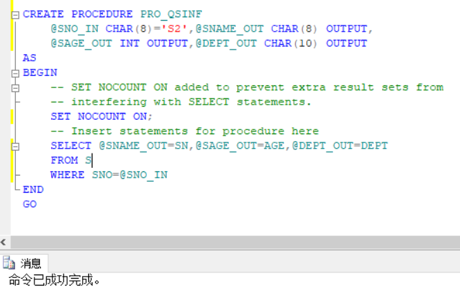 此过程并未进行赋值,也没有通过存储过程将查询结果数据传出,仅仅是在存储过程中通过查询语句得到查询表结果的页面显示上。具体的多行数据传出过程需要通过后续学习的游标才能真正完成实现。