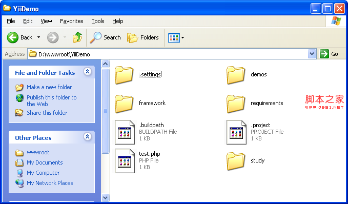 Apache的网站根路径为D:/wwwroot,在这个根路径下创建一个名为YiiDemo的文件夹,将从网上下载到的Yii压缩包解压之后,拷贝进D:/wwwroot/YiiDemo文件夹,文件结构如下: