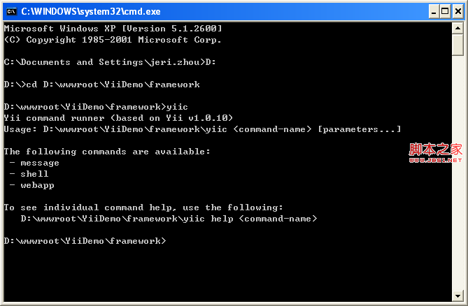 需要注意的是,如上图所示,因为yiic.bat文件在D:/wwwroot/YiiDemo/framework文件夹下,而当前命令行的工作路径是D:/wwwroot/YiiDemo/study,所以在运行yiic时建议使用全路径。