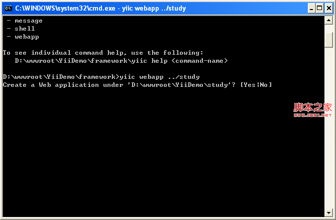 看到如上图所示的信息之后,就可以使用yiic来创建网站结构了,在本例中我们在D:/wwwroot/YiiDemo/framework(注意Apache中网站根路径为D:/wwwroot)下创建网站,网站名字为study,先在D:/wwwroot/YiiDemo/framework下手动创建study这个文件夹,然后使用如下命令创建网站:yiic webapp 网站路径,如下图:
