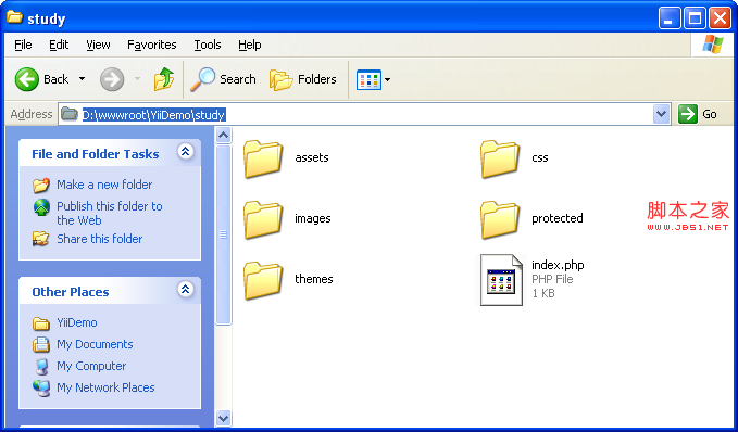 在输入创建网站的命令之后就会看到如上图所示的提示,键入”y”之后就会在D:/wwwroot/YiiDemo/study目录创建网站的框架结构,如下图所示: