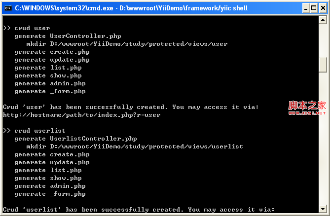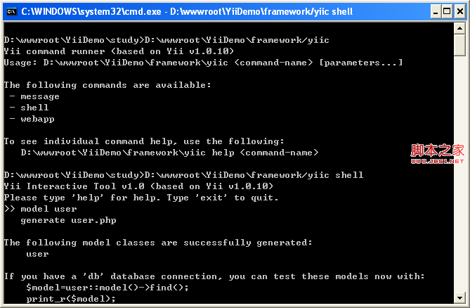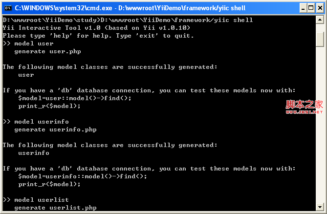 在此将继续使用yiic这个命令行工具,通过cd切换工作路径到D:/wwwroot/YiiDemo/study这个文件夹,然后在命令行中可以创建model和view文件。如下: