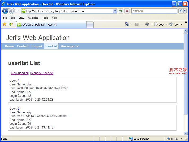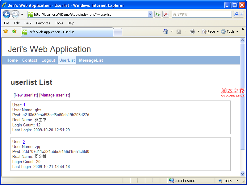 比如针对表user、userlist等使用model和crud命令之后,我们就可以在浏览器中查看这些文件了,如查看userlist表中的数据,可以在浏览器中输入http://localhost/YiiDemo/study/index.php?r=userlist,看到如下所示的图: