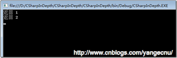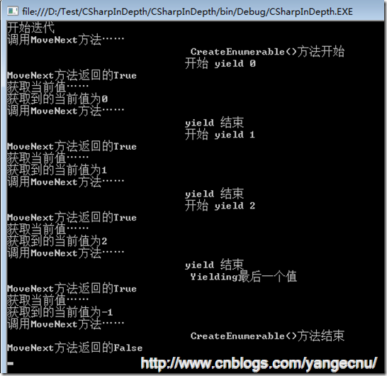 为了展示迭代的细节,以上代码使用了while循环,正常情况下一般使用foreach。和上次不同,这次在迭代方法中我们返回的是IEnumerable;对象而不是IEnumerator;对象。通常,为了实现IEnumerable接口,只需要返回IEnumerator对象即可;如果自是想从一个方法中返回一些列的数据,那么使用IEnumerable.以下是输出结果: