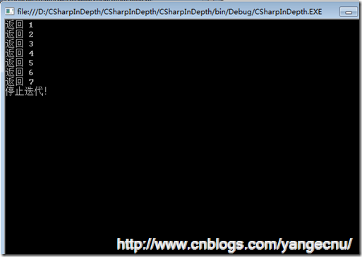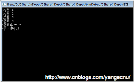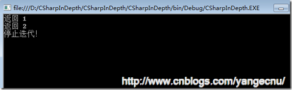 下图是输出结果,可以看出迭代语句正常终止,yield return语句和普通方法中的return语句一样,下面来看看finally语句块是什么时候以及如何执行的。