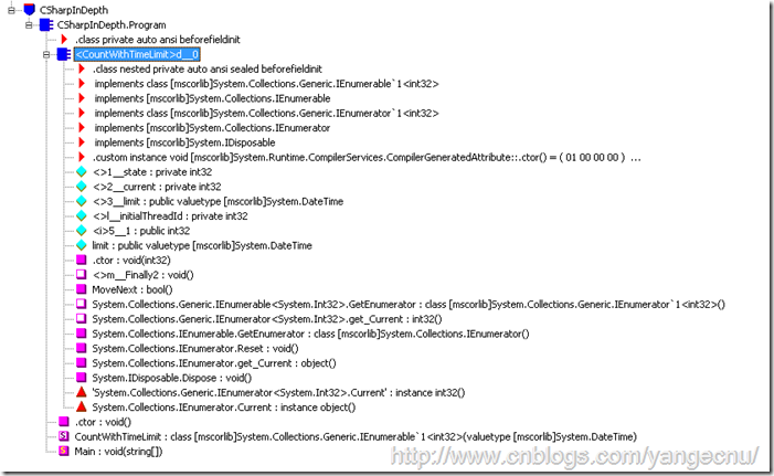 如果使用C#2的编译器将迭代块编译,然后使用ildsam或者Reflector查看生成的IL代码,你会发现在幕后编译器回味我们生成了一些嵌套的类型(nested type).下图是使用Ildsam来查看生成的IL ,最下面两行是代码中的的两个静态方法,上面蓝色的<CountWithTimeLimit>d_0是编译器为我们生成的类(尖括号只是类名,和泛型无关),代码中可以看出该类实现了那些接口,以及有哪些方法和字段。大概和我们手动实现的迭代器结构类似。
