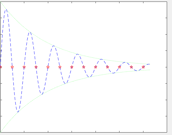 例5-16 分别以散点图、阶梯图和杆图形式绘制曲线y=2e-0.5x。